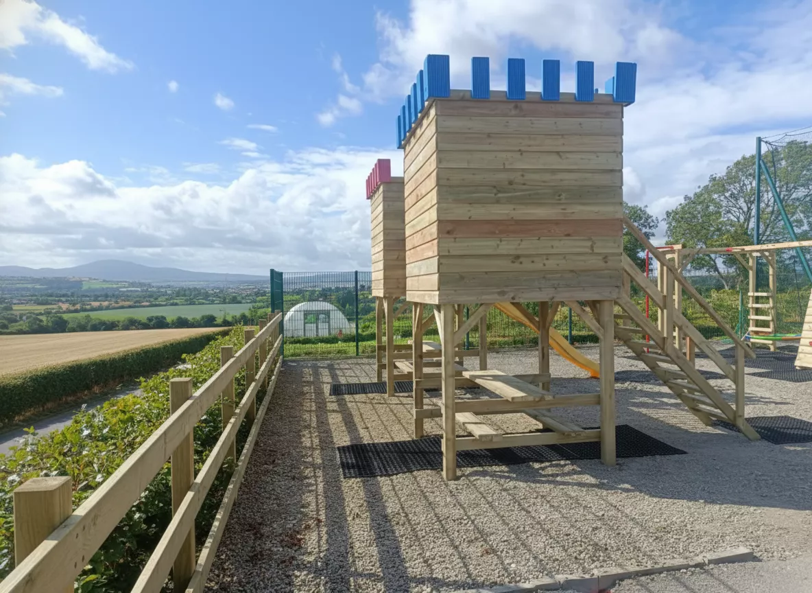 Our Castle playframe is 2 Castles connected with a bridge.
