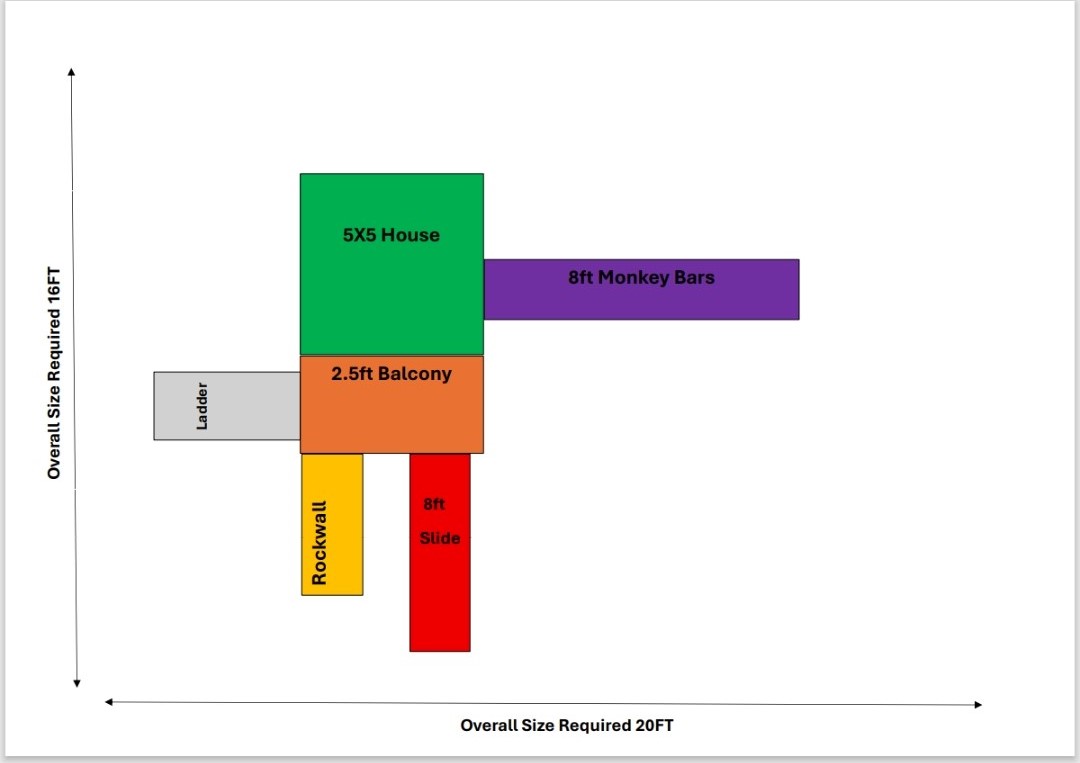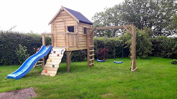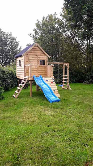 5FT X 5FT play house on a 4ft deck Rock wall & Ladder 8ft wave slide Monkey bars with 2 plastic swings