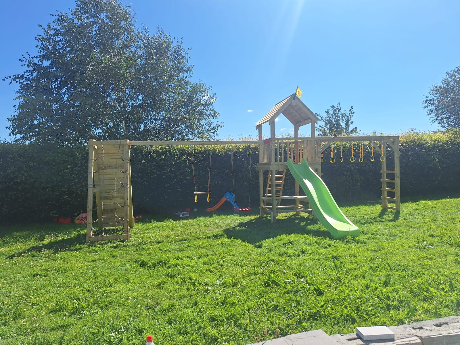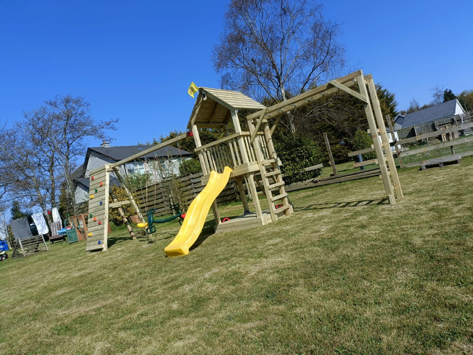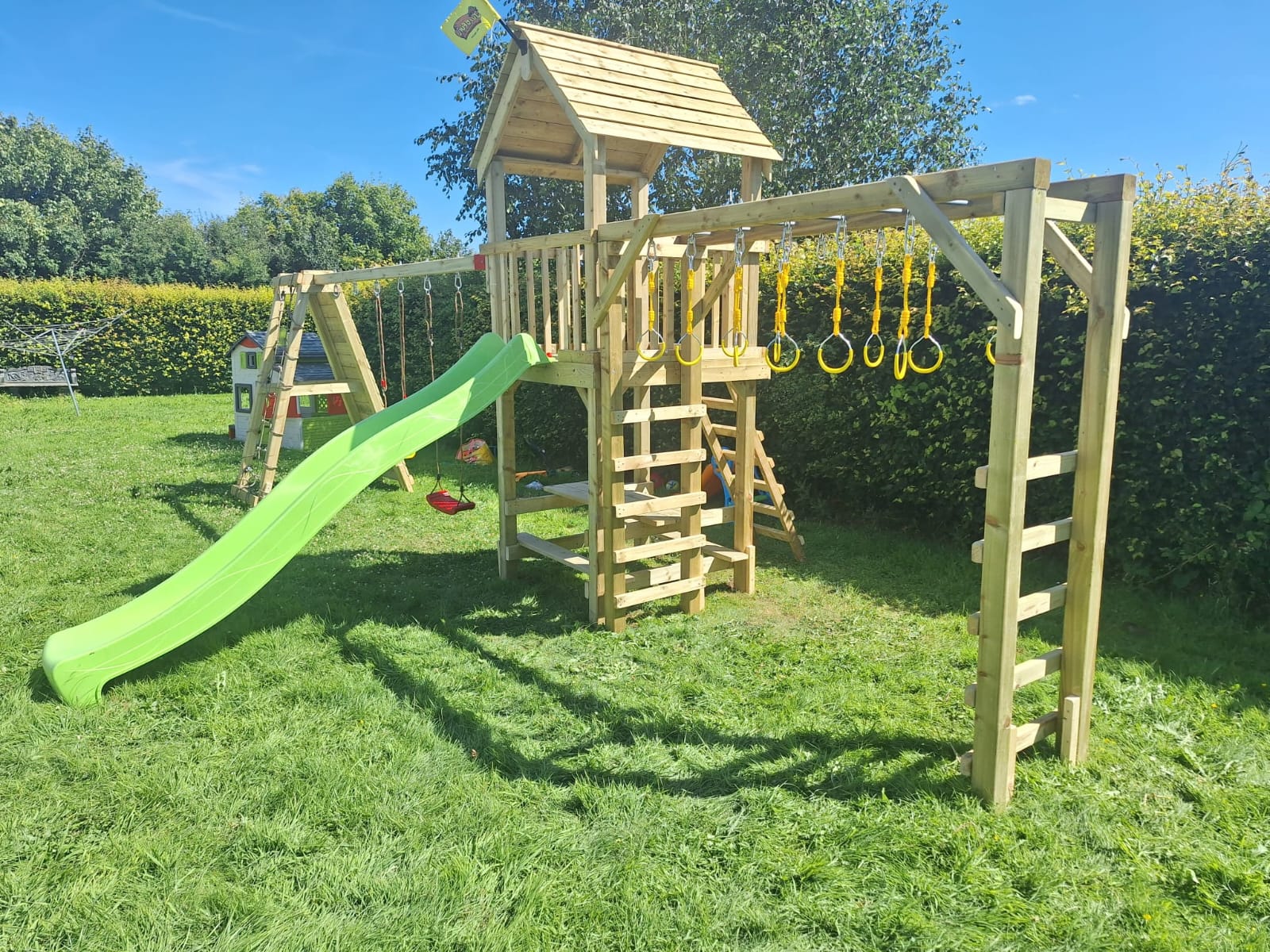 The Monkey Playframe is a premium, multi-functional outdoor activity center designed to challenge and entertain children while promoting physical development. Built with high-quality, pressure-treated timber to withstand the Irish climate, this robust structure combines classic garden favorites with strength-building climbing elements.